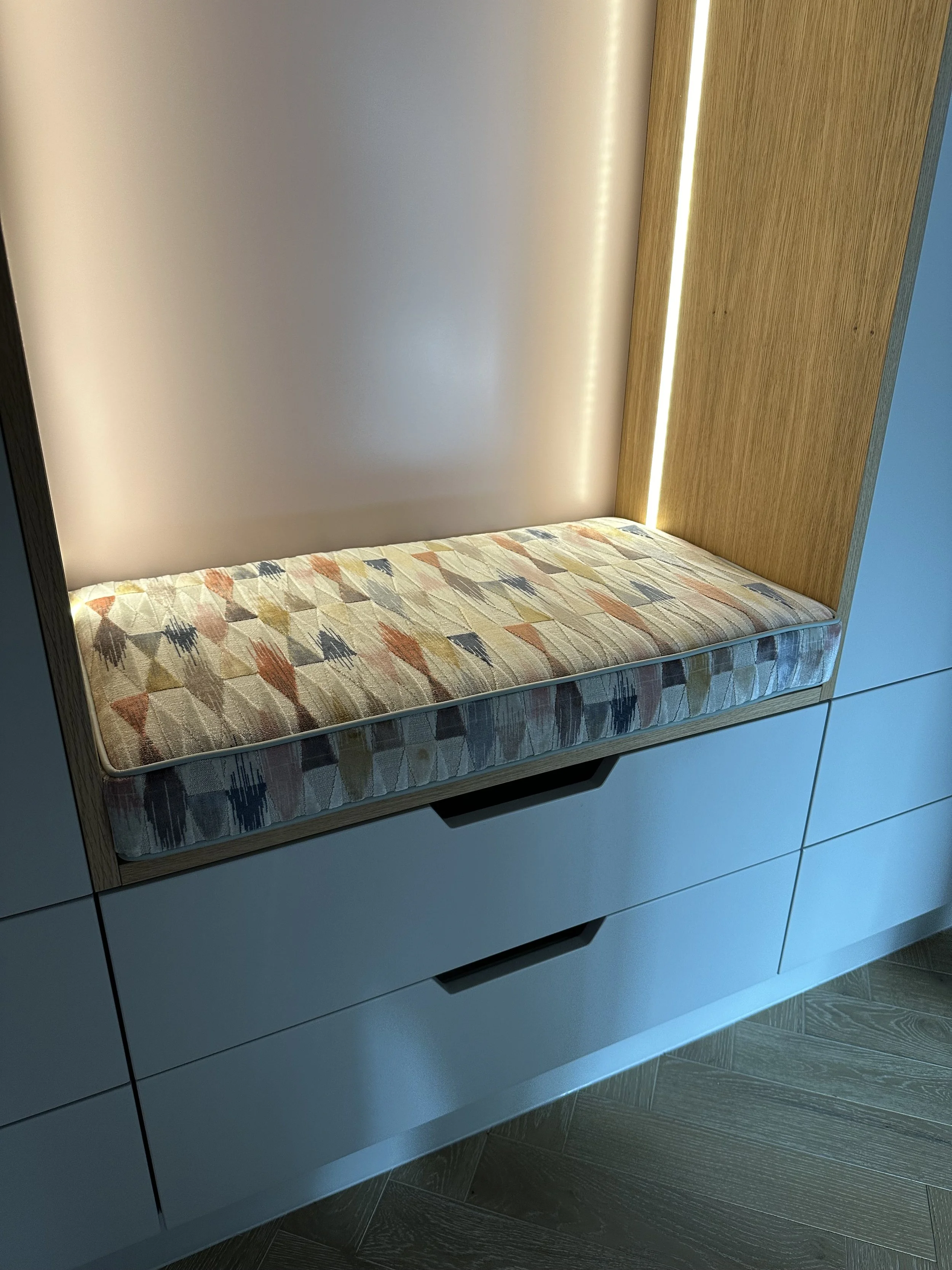 This much-loved footstool was given a fresh new look, reupholstered in vibrant Kravet fabric for a bespoke update. To tie it all together, matching scatter cushions were made from the same material, creating a cohesive and stylish finish.