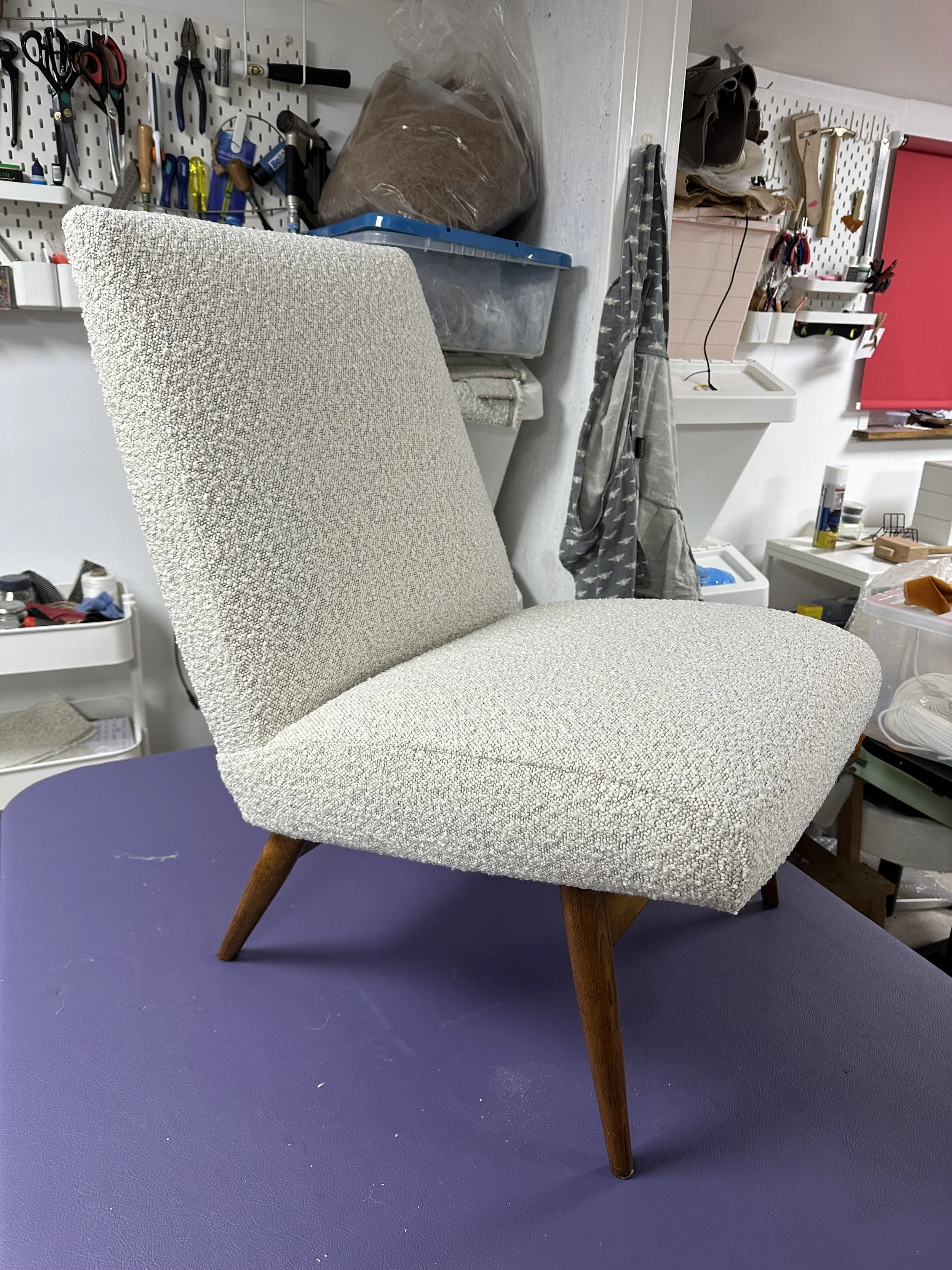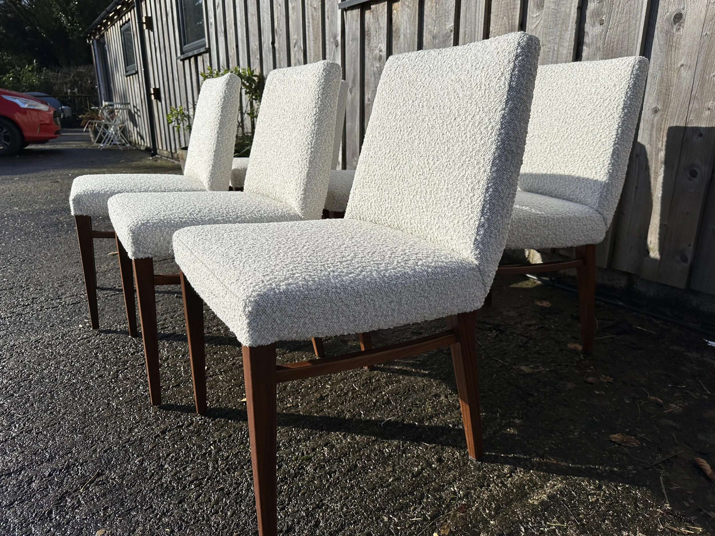 6 dining chairs taken back to the frame and rebuilt using modern materials for enhanced comfort and durability. Finished with a gorgeous cream bouclé fabric, they now blend timeless mid-century design with a soft, contemporary feel.