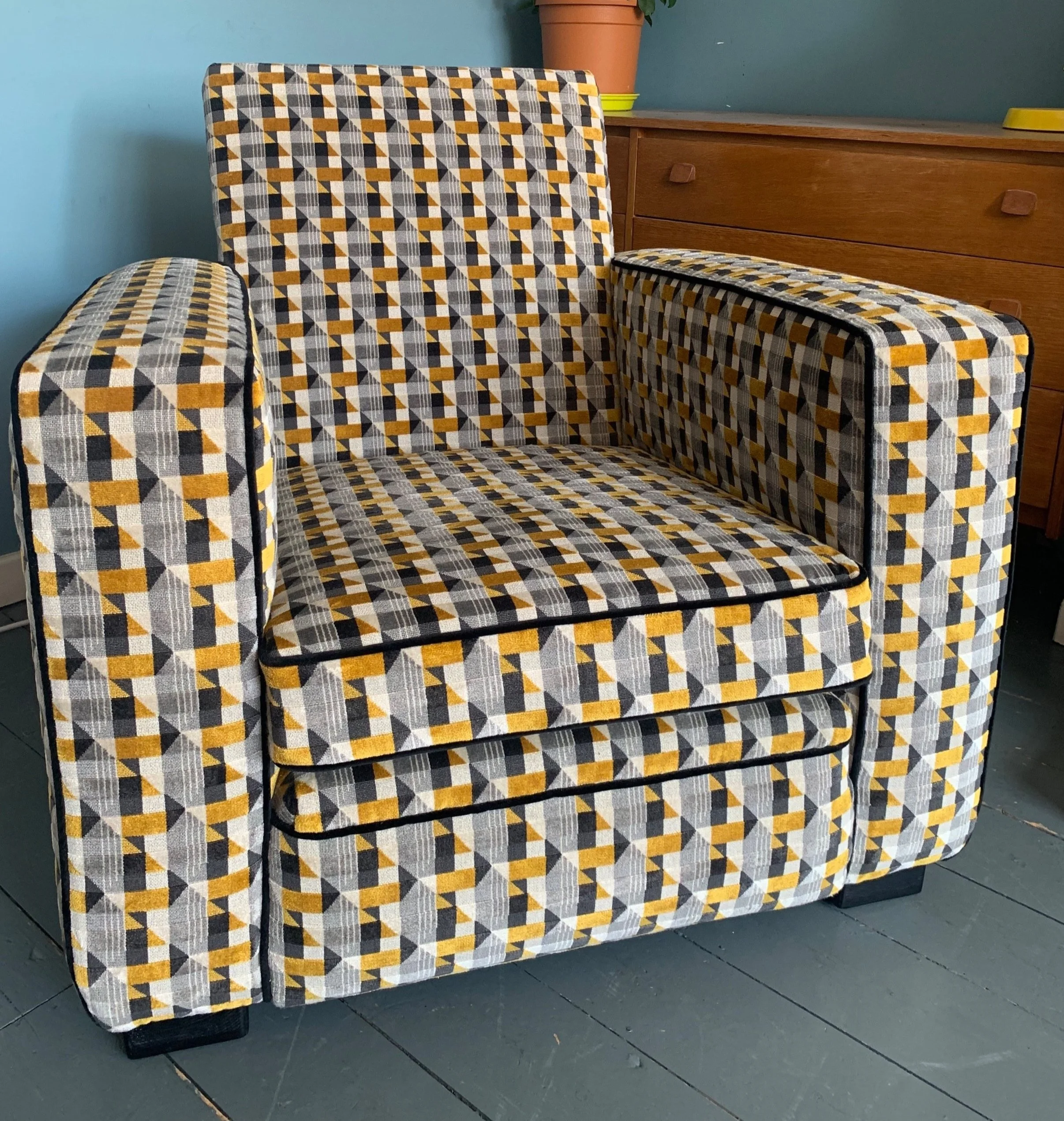 Stripped back to its frame and traditionally reupholstered using natural materials. All Hand-stitched, with horsehair and coir innards, this sprung seat, sprung arms, and sprung back armchair retains its original charm whilst being incredibly comfortable and hardwearing. The top fabric is a luxurious Kirkby Design velvet in Transport for London ‘Piccadilly’ design.